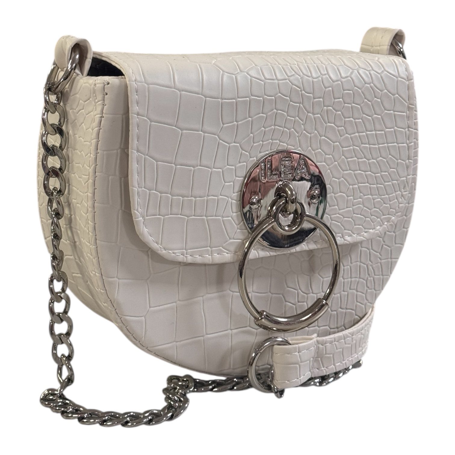 Ova upečatljiva torbica odiše elegancijom i modernim stilom. Napravljena od teksturiranog materijala, ističe se jedinstvenom metalnom kopčom, koja joj daje sofisticiran i trendi izgled. Lančani kaiš sa kožnim detaljem omogućava udobno nošenje preko ramena ili crossbody. Idealna je za večernje izlaske i posebne prilike, dodajući dašak luksuza svakoj kombinaciji!